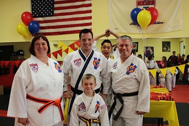 So the recent testing week was special for us. After all three of us successfully tested, we sat together as a family and were called up to receive our new belts. Then we stood in a circle of three, with a hand on the ends of each other’s belts, and at the appropriate time, we all pulled and tied our new belts on together as a family.